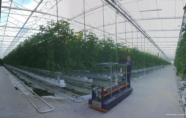 Les serres sont constituées d’une charpente métallique blanche, entièrement recouverte de verre. Tout y est entièrement piloté par des ordinateurs : régulation de l’hygrométrie et de la température, distribution d’eau, de CO2, ventilation naturelle …etc. La lumière est tamisée par des écrans mobiles qui se déploient en toiture et sur les façades en fonction de l’intensité du Soleil.